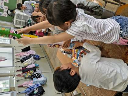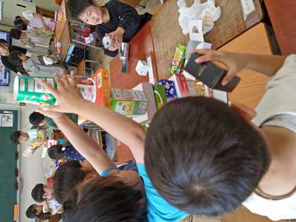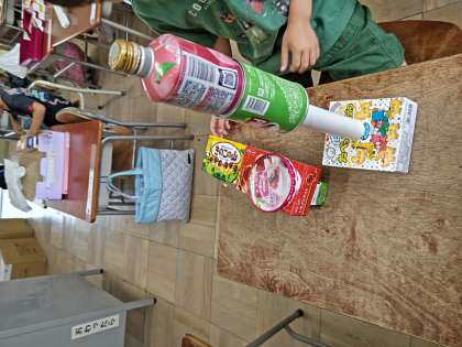 様々な形の箱を使って、高く積み上げたり、動物に見立てたりしました。子どもたちのユーモアが大いに発揮されていました。