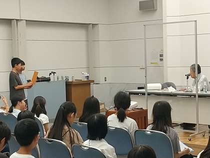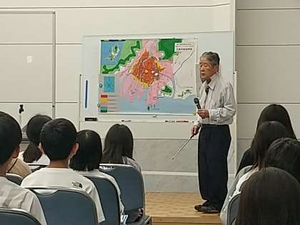 被爆体験者の豊永さんから話を聞きました。被爆者健康手帳(原本)を見せていただいたり、体験談をお聞かせいただいたりしました。神妙な表情で聞き、メモをとっていました。