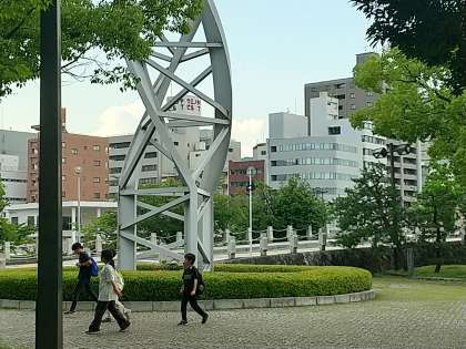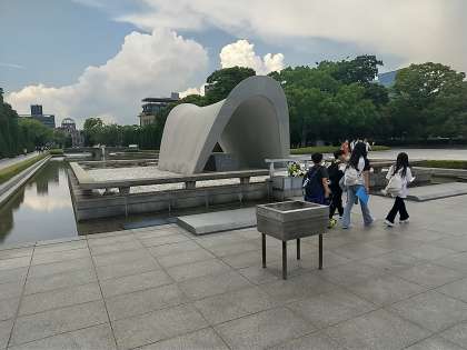 平和記念資料館の見学を終え、公園内でフィールドワークを行っています。17時まで班活動です。
