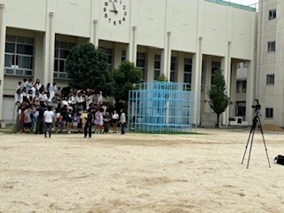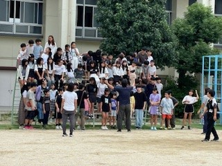 清水小学校での通称「たけのこ」(遊具を横から見るとたけのこの形に似ていることから、長年そのように呼ばれています)に登り並んで撮影しました。