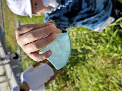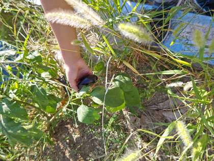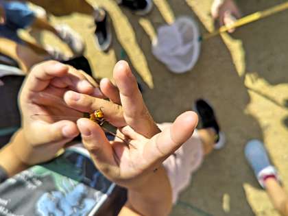 学習園で自然探しをしました。バッタやトンボ等の生き物や、ナスやオクラといった野菜、生き生きと育っている草花に実際に触れながら探していました。