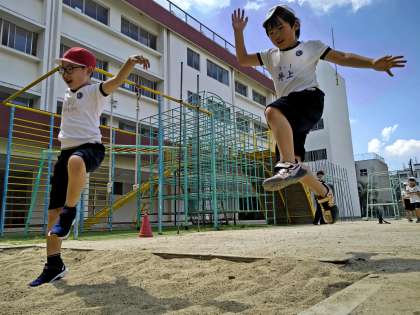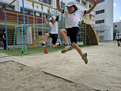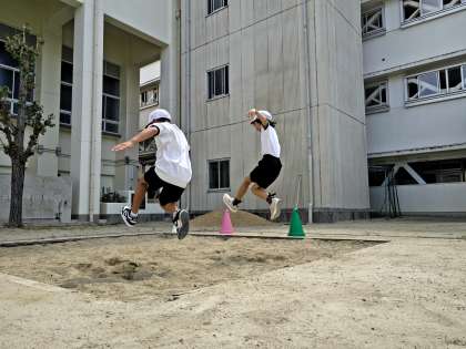 「とん、とん、とーん」のリズムに合わせて、遠くまで跳んでいます。なぜか、みんな笑顔です。