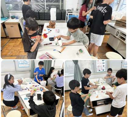 手芸クラブでは、プラ板づくりをしていました。オーブンで温めたプラ板が縮むのを、食い入るように見ていました。