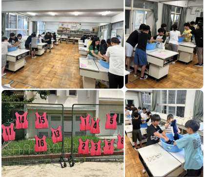 洗いとすすぎをくり返して、きれいになったゼッケンを運動場に干しました。