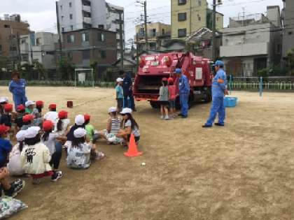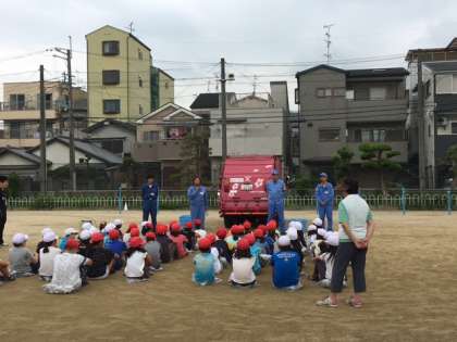 環境事業局の方が実際にパッカー車に乗って来校していただきました。ごみをパッカー車に入れる体験だけでなく、停止スイッチを押したり、乗車もさせていただいたりし、子どもたちは大喜びでした!多目的室では、ごみの分別クイズをしていただき、学習の幅をひろげることができました。