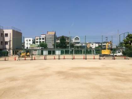 保護者のみなさま、子どもたちには、工事の関係で大変ご迷惑をおかけしております。西校舎があった場所に学習園と体育倉庫ができつつあります。また防球ネットも整備されました。