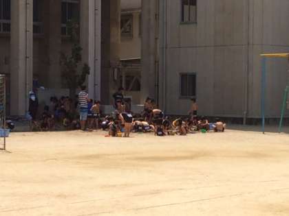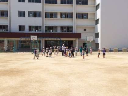 いい天気の中で1年生はシャボン玉をとばし、2年生はどろんこ遊びをしています。1年生はシャボン玉の液を作りました。2年生は水着姿なので、汚れることなんて気にならない様子です。普段はなかなかできないことを思いっきり楽しんでいます。