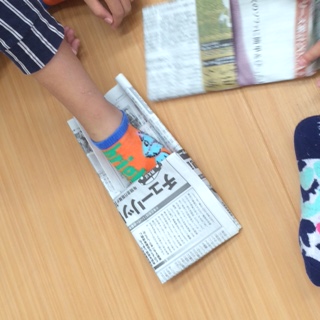 新聞紙でスリッパを作りました。非常時に、靴が見当たらなくてもこれでなんとかケガすることなく歩けます。旭区役所の方々、ありがとうございました。