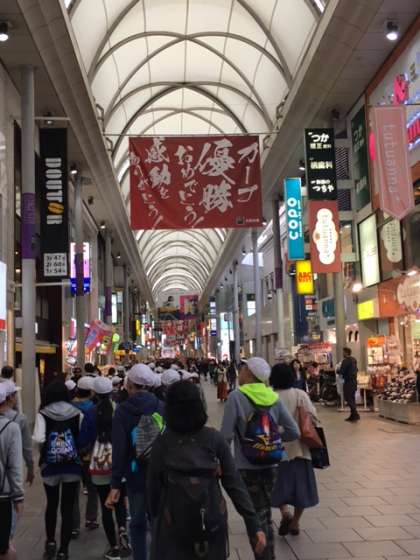 爆心地である島外科を見学し、広島カープの応援幕のたくさん出ている商店街をぬけました。商店街を抜けるとそこは宿舎です。全員元気で無事に、宿舎につきました。今から避難訓練をしたのち、夕食です。その後は、語り部さんのお話を聞く予定です。