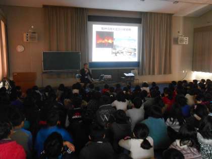 視聴覚室では、大阪市危機管理室の方が「じしんから身をまもるために」をテーマに実際の震災の映像も交えながら、わかりやすくお話をしていただきました。