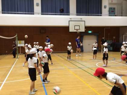 6月16日(金)3・4時間目に4年生がプロバレーボール選手「パナソニック パンサーズ」の選手3名に来ていただき、バレーボールについて教えていただきました。子どもたちは実際にボールを使って、190cm以上ある選手ととても楽しくふれあうことができました。