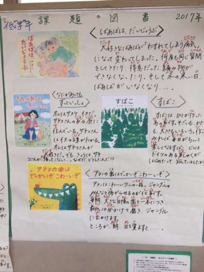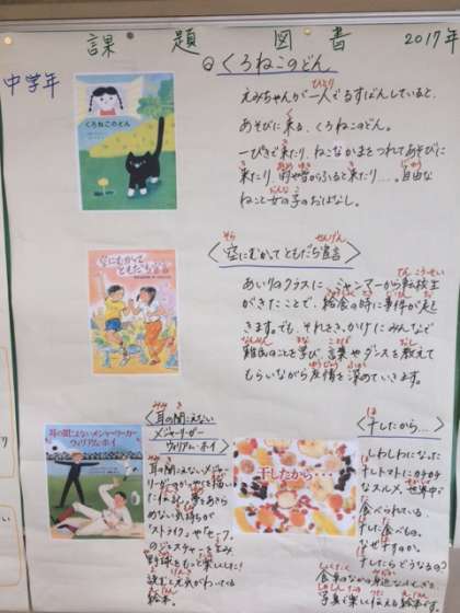 今年度の課題図書を知ってもらうために、図書室前の廊下に夏の課題図書の案内(学校図書館補助員さんの手作り)を作成・掲示しています。