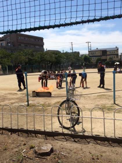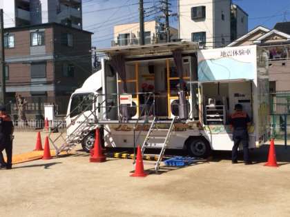 当日は、大阪市で2台しかない起震車が1台南運動場に来てくれました。さらに、校区をフィールドワークに出たり、水消火器で消火体験をしたり等、子どもたちは各学年でさまざまな体験をすることができました。