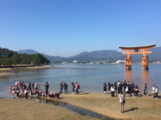 ちょうど引潮でもあったので、鳥居近くまで行くこともできました。お土産もじっくりと友だちと選びながら、買い物を楽しみました。いよいよ最後のお楽しみ、お好み焼きの昼食に今から向かいます。