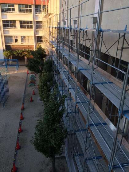 安全のため、晴れの日は足場の下の廊下は基本的に通行止めにしています。雨の日は、作業を配慮して通行可能する予定です。