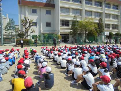理科室からの火災を想定した避難訓練を実施しました。子どもたちは、ハンカチなどで鼻・口を押えながら真剣な表情・態度で訓練に取り組んでいました。避難した後の旭消防署の方からの話にもしっかりと耳を傾け、聞き入っていました。