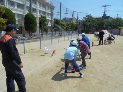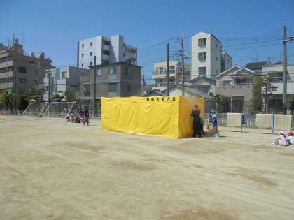 終了後には、2年生が煙体験を5年生が消火体験を行いました。万が一に備えて、旭消防署の方の指示に従い、熱心に取り組むことができました。