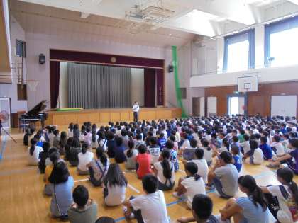 講堂に集まった子どもたちは、校長先生、森川先生の話に熱心に耳を傾けていました。1学期がんばったことや夏休みにがんばりたいこと、夏休みの過ごし方などについて、しっかりと考えながら聞き入っていました。
