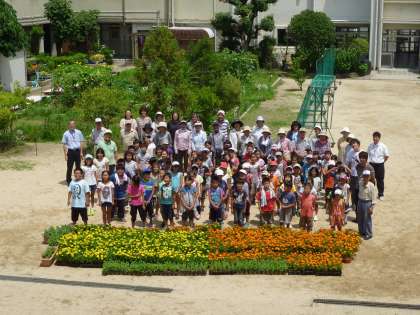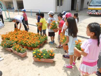 5月中旬に地域の方と一緒にマリーゴールドなどの種をまきました。それから今日までの約2か月間、子どもたちは、水やりの世話をするなどして、大切に育ててきました。また、土、日曜日には、地域の方にも来校していただき、水やりをしていただきました。