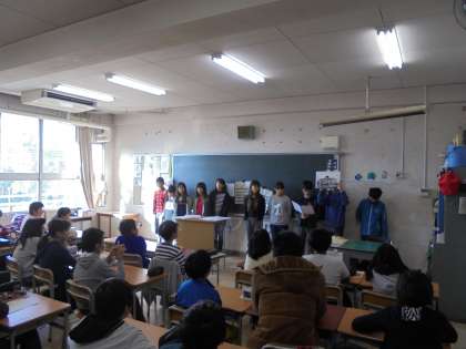 朝の時間に6年生が、修学旅行で学んだことを1〜5年生のみんなに報告をしました。