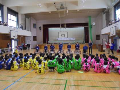 4年生からは、リコーダー演奏、応援の横断幕、感謝の気持ちを込めたメダルなどをプレゼントし、イギリスチームのみなさんからは、デモンストレーションをはじめ、車いすバスケットボール体験やミニゲームなど、たくさんの時間を笑顔で関わっていただきました!