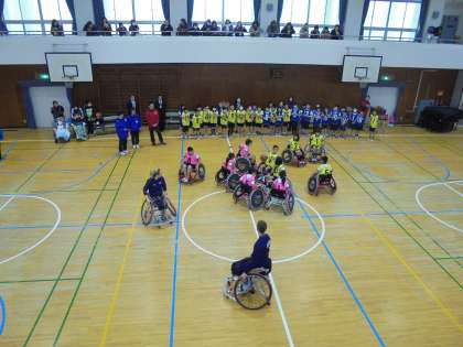 女子車いすバスケットボール イギリスチームの選手・スタッフ・大会関係者の方々を迎え、4年生ととっても楽しい交流を開くことができました。