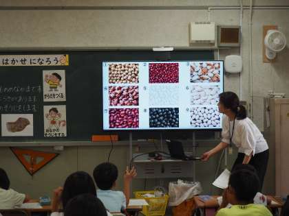 授業では、たくさんの種類の豆が紹介され、子どもたちは「こんなにもあるの!?」と驚きの声をあげていました。