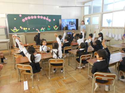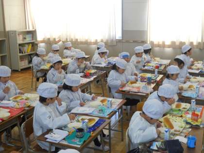 4月9日から給食が始まりました。1年生の子どもたちは、小学校での初めての給食です。栄養教諭の先生から給食についての授業があり、初めての給食をしっかり食べることができていました。