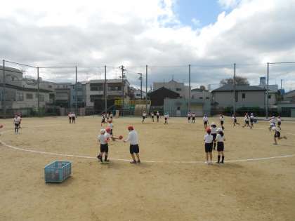 5年生は運動場で体育の学習を行っていました。大きな円の中をボールを持って走っていました。体力づくりや仲間づくりにつながります。