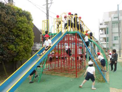 1年生は、体育の学習で運動場の大きな遊具を使って体を動かしていました。