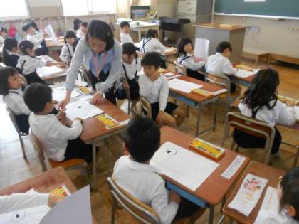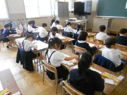 本日は、本年度最初の学習参観・懇談会がありました。それぞれの学年の様子を紹介します。1年生は図画工作科でこいのぼりをかきました。