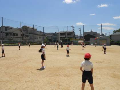 4年生は、快晴のもと運動場で体育の学習を行っていました。スポーツテストもありますので、ボールを投げる練習をしました。初めは、ボールではなく、ロケットのような形をしている教具を使っていました。