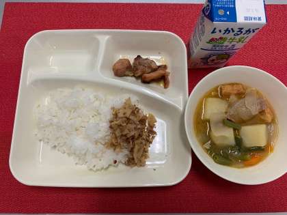 今日の献立は、『鶏肉のてり焼き・じゃがいもとあつあげの煮もの・ごまかかいため・米飯・牛乳』でした。