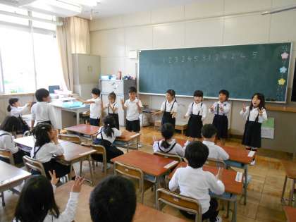 1年生の朝の会のようすです。わらべ歌をうたって過ごしていました。一日のスタートはとても大切です。