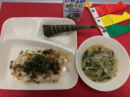 今日の献立は、こどもの日の行事献立で『牛肉のちらしずし・すまし汁・ちまき・牛乳』でした。
