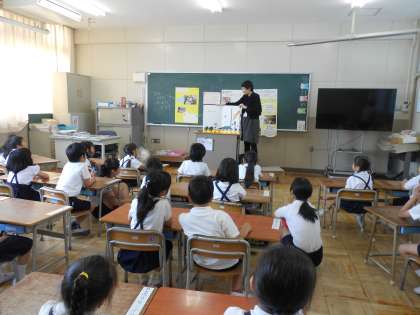 今週は読書週間です。朝の会の時間に、読み聞かせボランティア「ひこうせん」の皆様にお越しいただいています。今日は、1年2組で絵本の読み聞かせをしていただきました。子どもたちは一生懸命聞くことができていました。