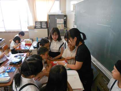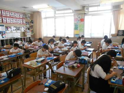 5年生は家庭科の学習に取り組んでいました。裁縫道具を使い、本返し縫いや半返し縫いの練習をしていました。子どもたちは真剣なまなざしで針先を見ていました。