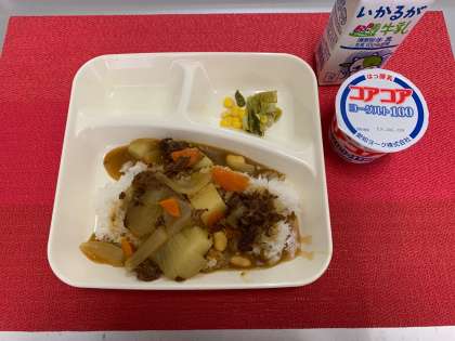 今日の献立は、『牛肉と大豆のカレーライス・レタスとコーンのサラダ・ヨーグルト・牛乳』でした。