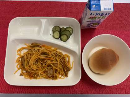 今日の献立は、『スパゲッティミートソース・きゅうりのバジル風味サラダ・黒糖パン・牛乳』でした。
