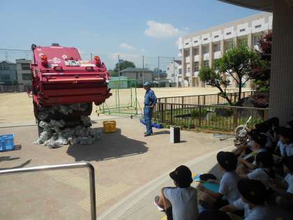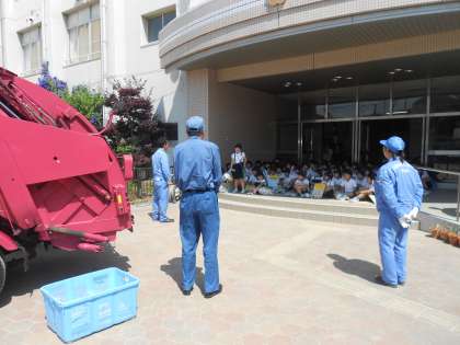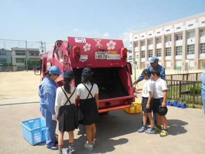 6月6日(木) 4年生の社会科の学習でごみの行方について学習しています。2・3時間目は、環境事業局の皆様にお越しいただき、実物のパッカー車を見せていただきました。実際に紙ごみを投入したり、パッカー車の動く様子を見学させていただきました。環境事業局の方からは、パッカー車の色が違う理由や曲の違いについて教えていただきました。