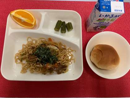今日の献立は、『焼きそば・オクラのかつお梅風味・オレンジ・黒糖パン・牛乳』でした。