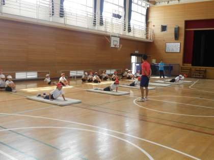 2年生は残念ながら水温が低かったため、プール水泳の学習ができませんでした。今日は今市中の体育の先生が来られる日でしたので、マット運動を指導していただきました。