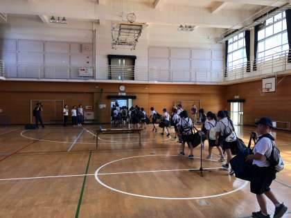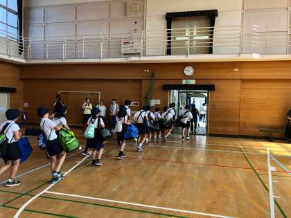 出発式を終え、子どもたちは大きな荷物を抱えて出発しました。