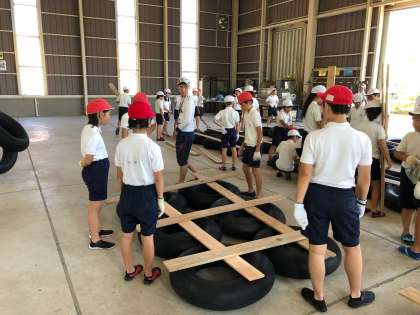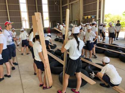 午前中のプログラムはいかだ作りです。グループで最初からいかだを組み立て、海に漕ぎ出します。いかだ作りの様子を紹介します。