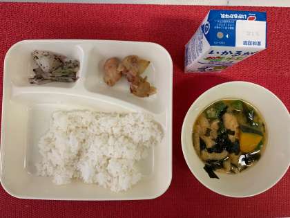 今日の献立は、『鶏肉の甘辛焼き・みそ汁・キャベツの赤じそあえ・米飯・牛乳』でした。