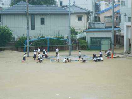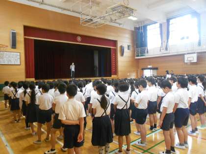全校朝会と1年生の様子です。運動場では、雨水がたまった運動場で生活科の学習に取り組んでいました。