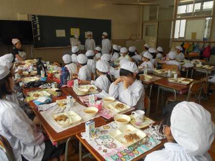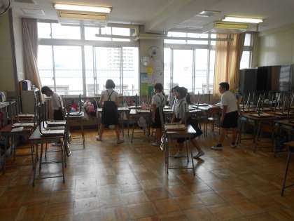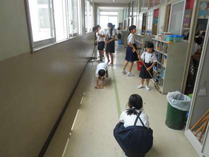 給食を食べた後は、いっしょに掃除もします。みんな一生懸命掃除をがんばっていました。