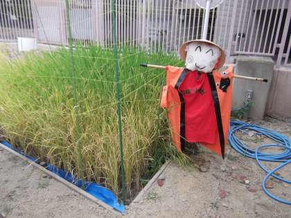 学校の田んぼと、住吉大社の御田を守る「かかし」が完成しました。