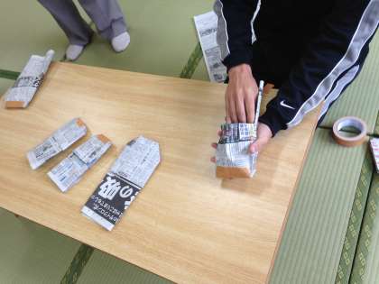 新聞紙でスリッパを作り、