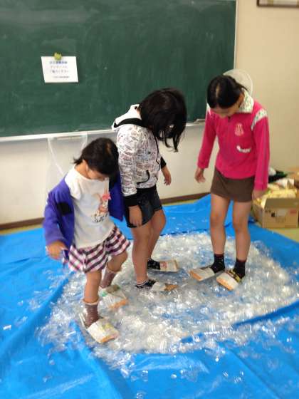 ペットボトルを細かくしたものの上を歩く体験